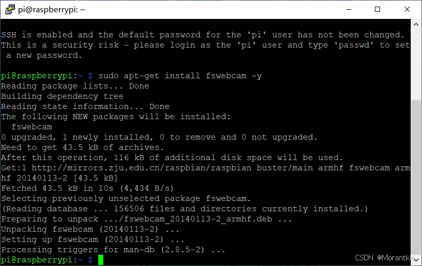 4、安装fswebcam视频软件: ** sudo apt-get install fswebcam -y **