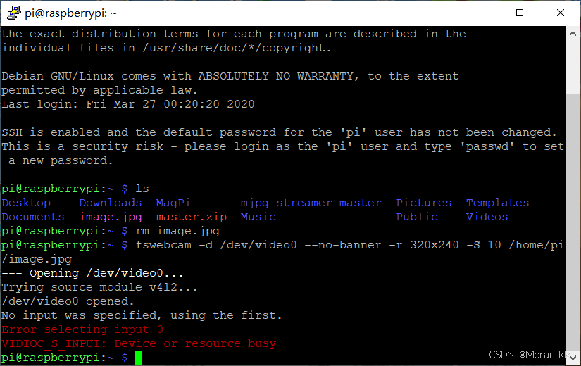 确认可以拍摄画面之后,需要通过ctrl+c退出,才能进行下一步操作选择一个画面进行拍摄图片。否则同时运行mplayer 和使用fswebcam命令会报如下摄像头忙碌的错误。