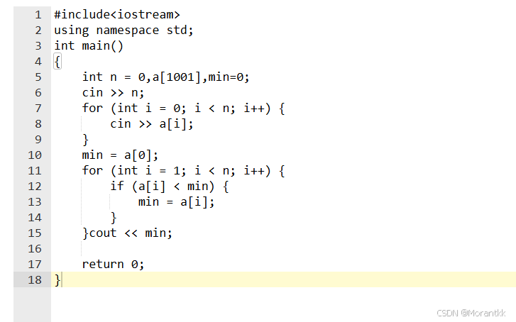 思路:先输入n个数存入数组中,再在数组中找到最小值